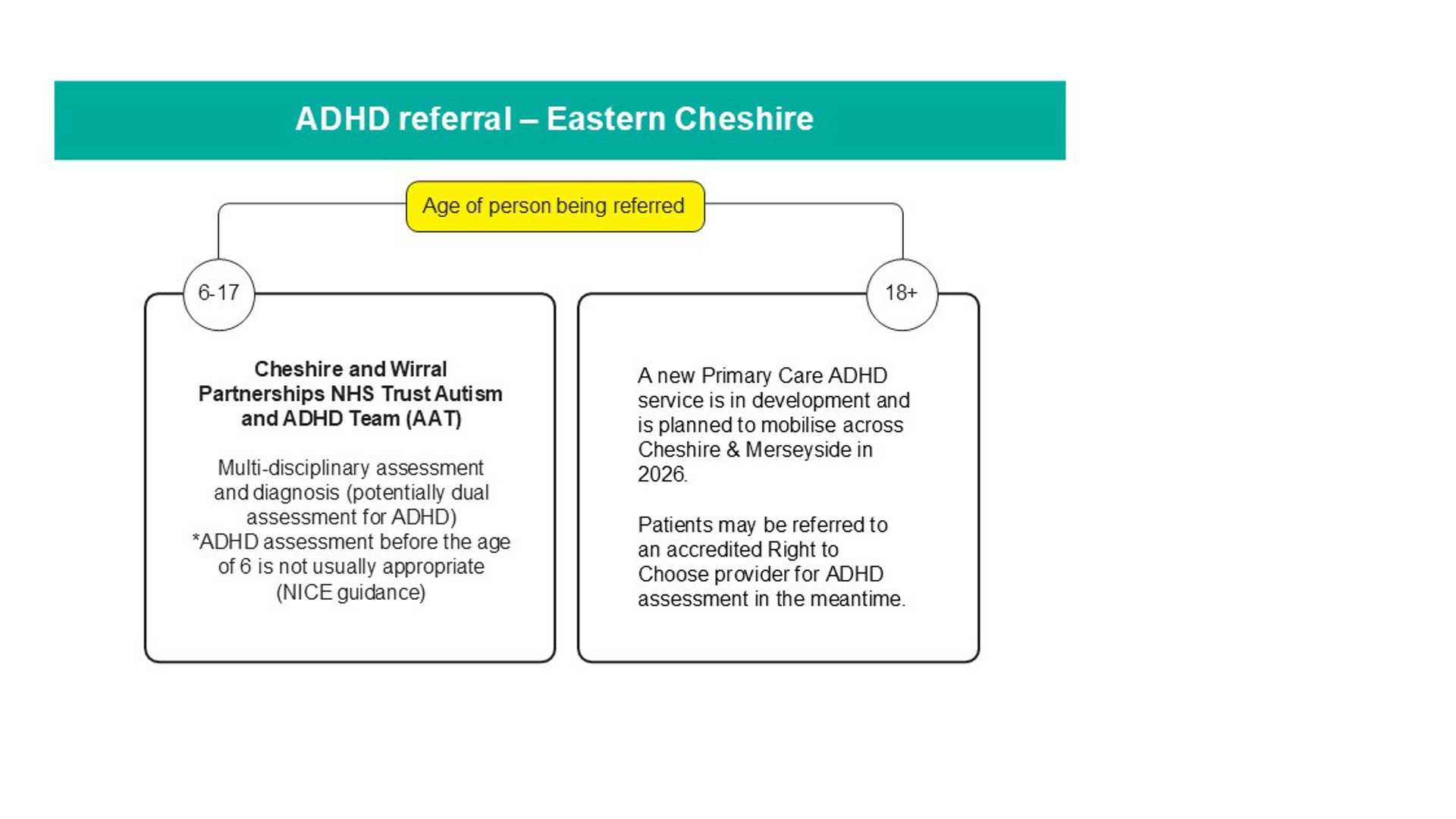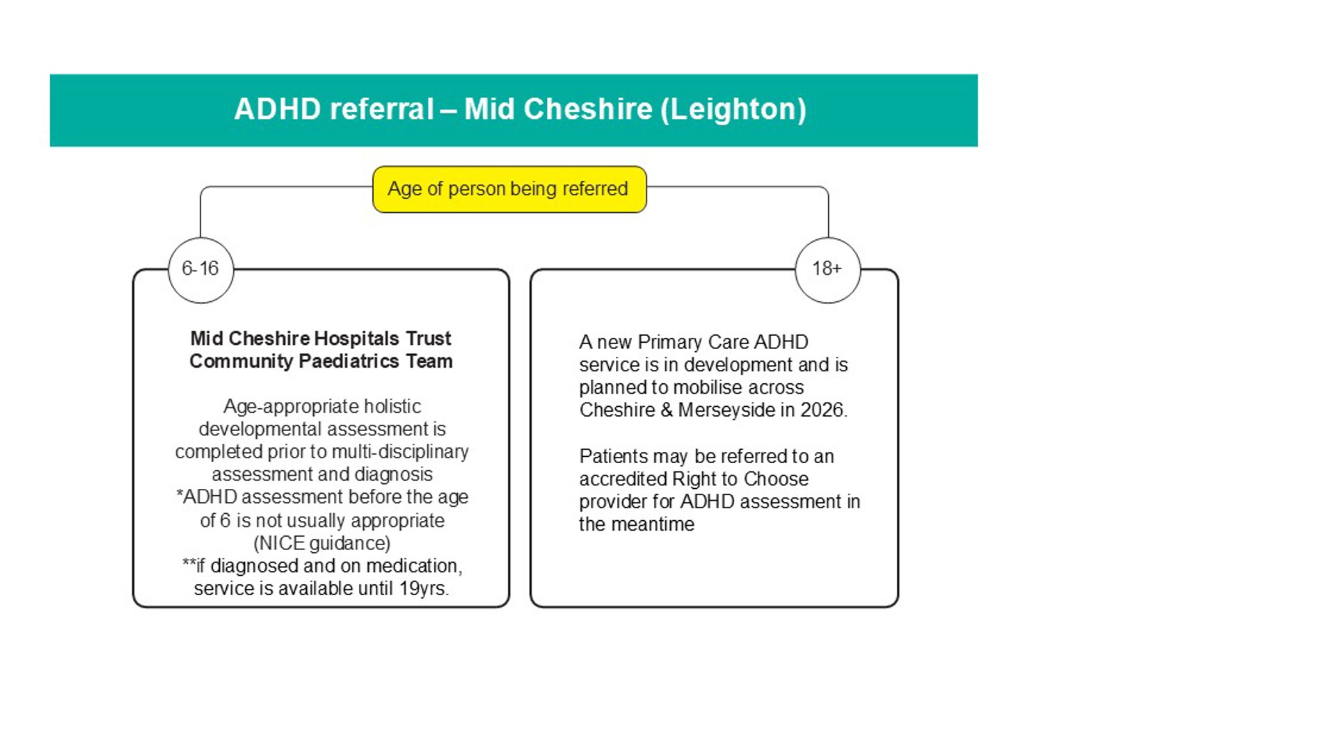 There are a number of different referral pathways, depending on whether your GP is within the Eastern Cheshire (Macclesfield) or Mid-Cheshire (Leighton) area and the age of the person being referred. If you’re not sure which catchment area your GP is in, you can find out here.